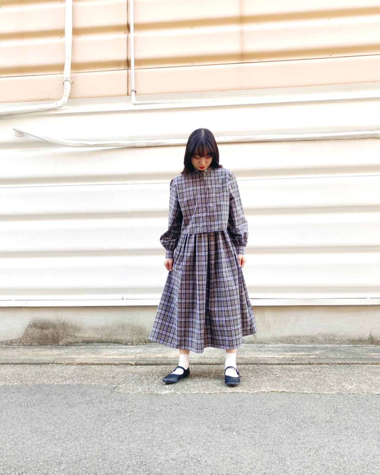 シマオリの幅広を生かしたボリュームのあるワンピースドレス。重ね着したような身頃のデザイン、その下のウエストに隠れるたっぷりのギャザーがかわいいアイテムです。